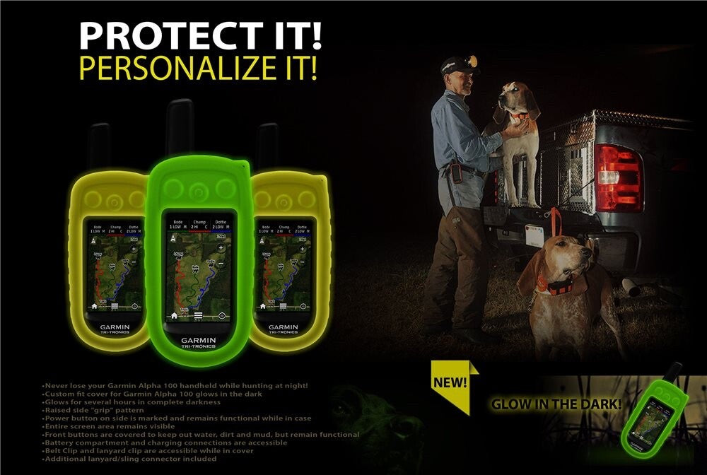 Never lose your Alpha 100 handheld while hunting at night! Available in your choice of Green-Glow-in-the-Dark or Orange-Glow-in-the-Dark, this custom cover will glow for several hours in complete darkness. When your hunt is over, simply expose the AlphaGlo cover to light to "re-charge" its glowing ability and it will be ready to go for your next hunt. This custom cover allows hunters to easily identify his handheld (especially helpful when hunting with multiple Alpha users). A lot of thought went into this design and you'll appreciate the many handy features. The raised side "grip" pattern allows for better handling of the unit (even when wearing gloves). The side of the cover is marked to identify the Alpha's power button and the button remains fully functional while in the case. The Alpha's entire screen area is visible while in the cover. And most importantly, all of the front buttons on the Alpha are covered to eliminate water, dust, dirt, debris, and mud from entering. The Custom Alpha Cover has clear markings for all buttons, which remain fully functional while the cover is on the unit. The cover includes a small opening at bottom which allows use of the Alpha's included lanyard clip. An additional lanyard/sling connector is located at the top of case, near the antenna opening for additional carrying options. The Custom Alpha Cover's back opening allows access to the Alpha's heavy-duty belt clip, battery compartment, and charging connections - no need to take the unit out of the cover.